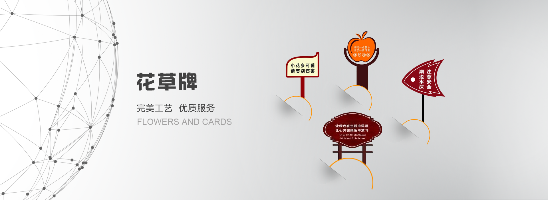 花草牌是指樹立在花草叢中用于提示愛護(hù)的標(biāo)識(shí)牌。又稱牌或草牌,屬于溫馨提示的范疇。花草牌一般較矮,一般高度在40公分到1.2米之間,是雙面,厚度一般是4公左右。有鋼板的,有純實(shí)木的,或上述材質(zhì)相互結(jié),制作工藝為: